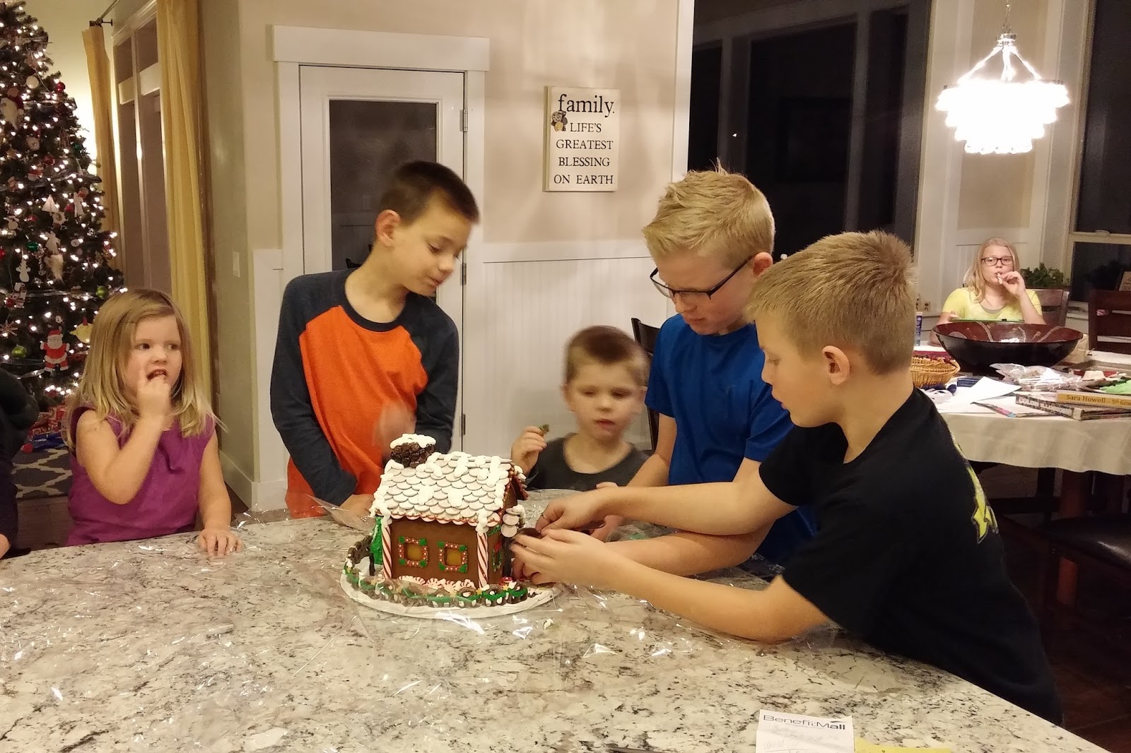 Every year Scott's boss gives him an elaborate gingerbread house.  The first year, I saved it all month to look at, before letting the kids eat it after Christmas.  But by then it was rock hard, and no one wanted to eat it.  So since then, I let the kids eat it the same day we receive it.  They love getting to dig into it, tear it apart, and eat it all up.