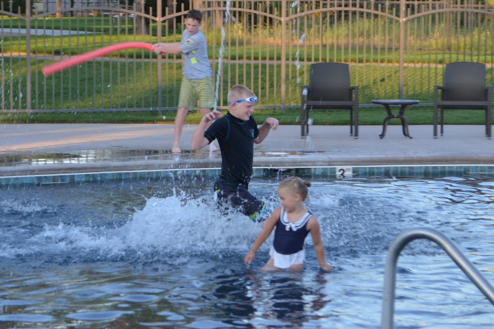 Carter had to go home for a bit to mow the lawn.  We had pizza for dinner as a family.  Then we met up with the Moores at the pool for some birthday swimming.