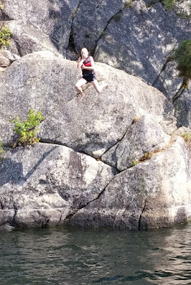 The kids loved the rocks. The bigger kids were more adventurous in jumping than Aaron and Nate. The small rock was enough for them. But Josh, Savannah, and Sara got up the courage to jump off the tall rocks. Owen stayed on the boat with Scott, Kate, and me.